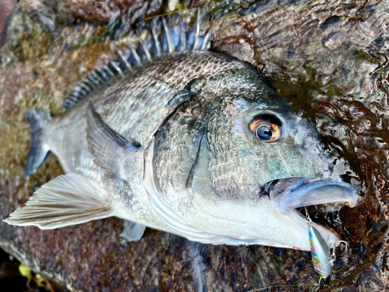 そして、真っ先にルアーを捉えたのは、見えチヌの中で一番大きい目測で40cmほどのサイズだ。
