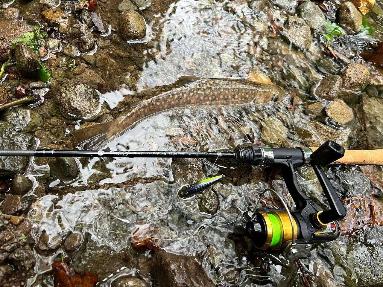 水中のルアーは根掛状態のまま後で回収するとして、水面から水中に突き刺ささった友人のラインの脇へ私がキャストすると、その1キャスト目に良型のイワナがアグレッシブにバイトしてきた。