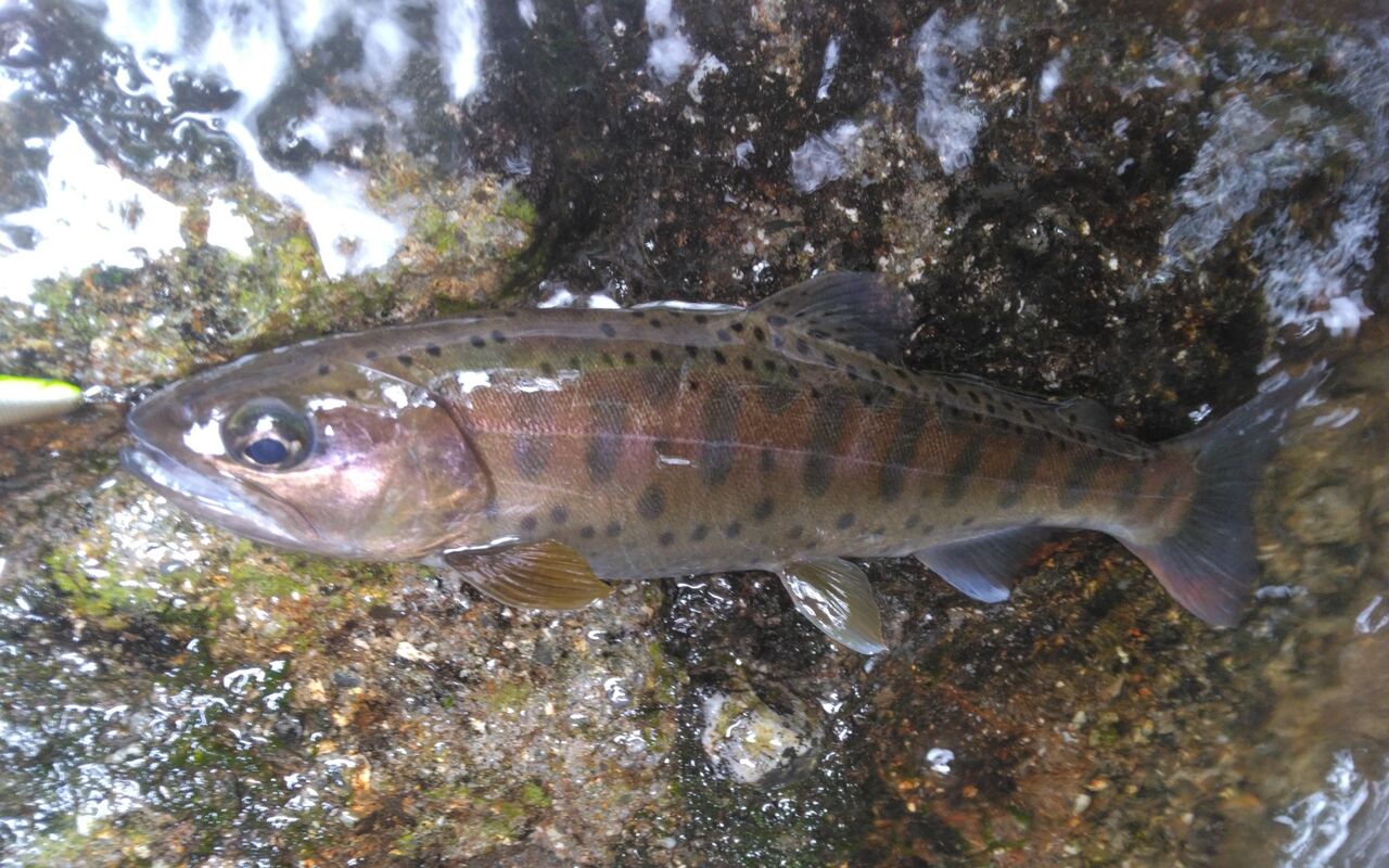 アップでキャストし、細かくトイッチしながら引いてくると、斑点の大きいアメマス系のイワナが来てくれました。