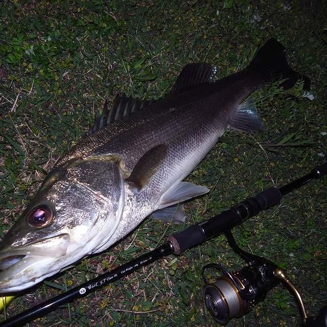 増水した河川の下げ潮の中、小型のバイブに付いているフックが小さいため、無理をしてフックが伸びてしまわないよう、慌てずやり取りして無事にキャッチすることができました。
