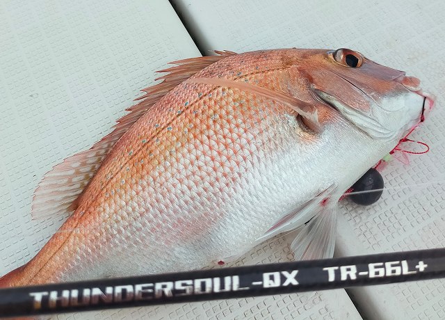 しっかり着底が感じられて、巻きはじめ1秒程度のリーリングで勢い良くひったくっていった元気な真鯛でした。