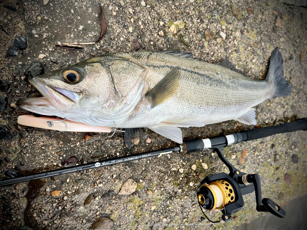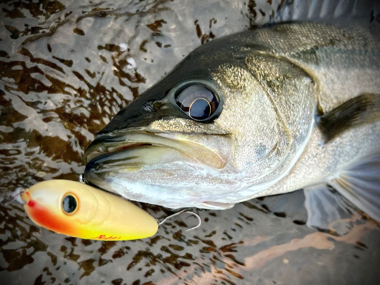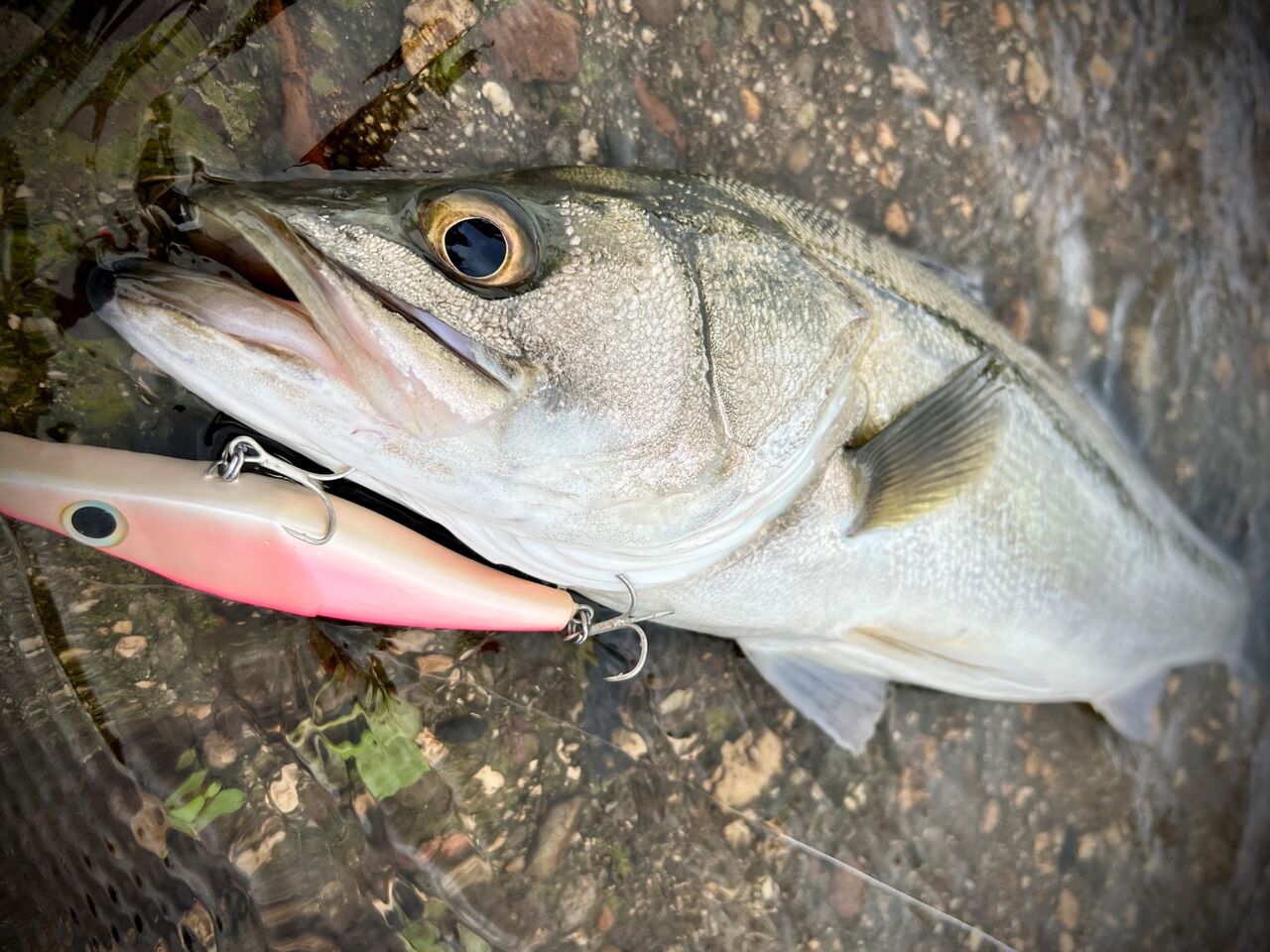サイズこそ60あるなしまでと伸び悩みましたが、流れの脇と反転流との境目をダイレクトに撃ったペンシルに川鱸がもんどり打ってバイトしてくる姿が丸見えなど、このゲームならではの興奮必死のヒトトキを、存分に満喫することができました。